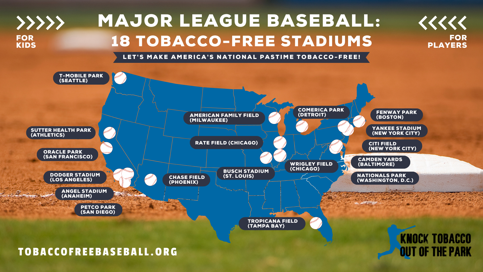 Over half the Major League stadiums (18 of 30) are completely tobacco-free as a result of state and local laws. In addition, the current collective bargaining agreement (CBA) between players and owners prohibits new MLB players from using smokeless tobacco, like chew, dip and snuff. The agreement also makes violations of local tobacco-free stadium laws violations of the CBA as well, strengthening enforcement.